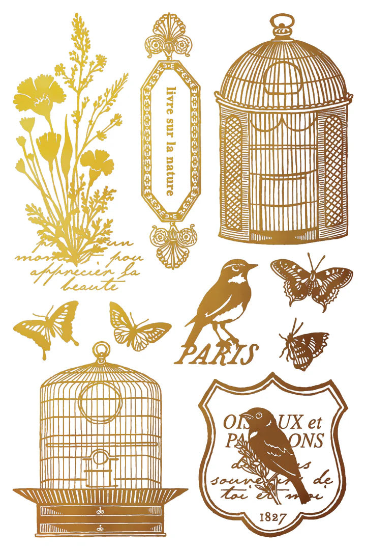 Papillon layers beautifully across a range of surfaces and can be used to create striking focal points or subtle gilded accents. The birdcages pair especially well with floral collections like Madeleine, allowing for elegant, mixed-style compositions. Whether applied to books, trays, décor pieces, or mixed-media artwork, this transfer adds a refined metallic touch that complements both vintage and modern projects.